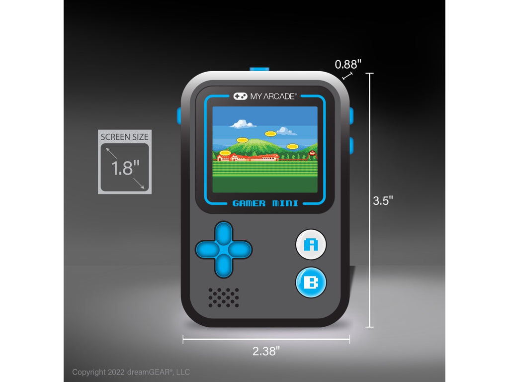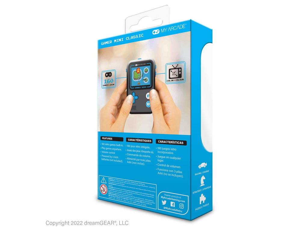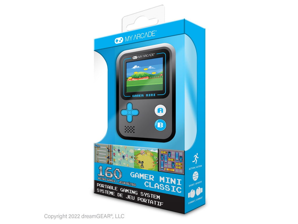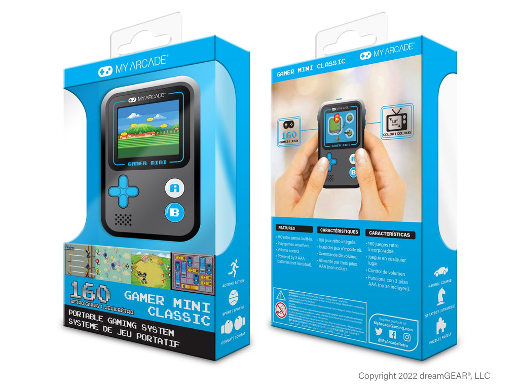 Denne lille spillmaskinen er stappfull av moro – med hele 160 ferdiginstallerte retrospill kan du spille hvor som helst, når som helst! Den passer perfekt i lommen, vesken, sekken eller ryggsekken, og er ideell både for barn og voksne.