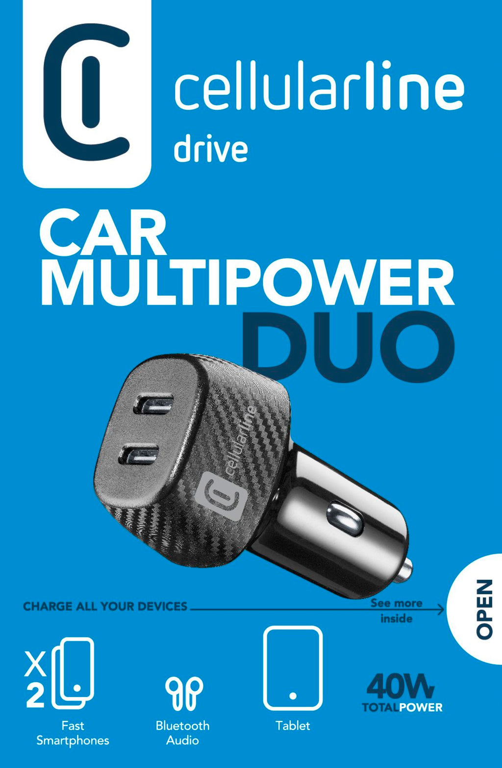 Cellularline Multipower DUO biladapteren er en pålitelig ladeløsning for både nettbrett og mobiltelefoner. Denne laderen leverer strøm med flere spenninger på 5 V, 9 V og 12 V, noe som sikrer kompatibilitet med ulike enheter. Med en total utgangseffekt på 40 W kan adapteren gi effektiv lading for to enheter samtidig gjennom sine doble 24-pinners USB-C-utgangskontakter. Den er designet for bruk i bil og kan enkelt kobles til sigarettenneren, noe som gjør den til et praktisk tillegg for lading på farten. Sikkerhet er prioritert med funksjoner som overbelastningsbeskyttelse og kortslutningsbeskyttelse, noe som gir trygghet under lading. Hurtigladeteknologien, kjent som Power Delivery, muliggjør raskere ladetider, slik at brukerne kan fortsette dagen uten lange ventetider. Cellularline Multipower DUO er et tilbehør for alle som trenger å holde enhetene sine ladet mens de er på farten.