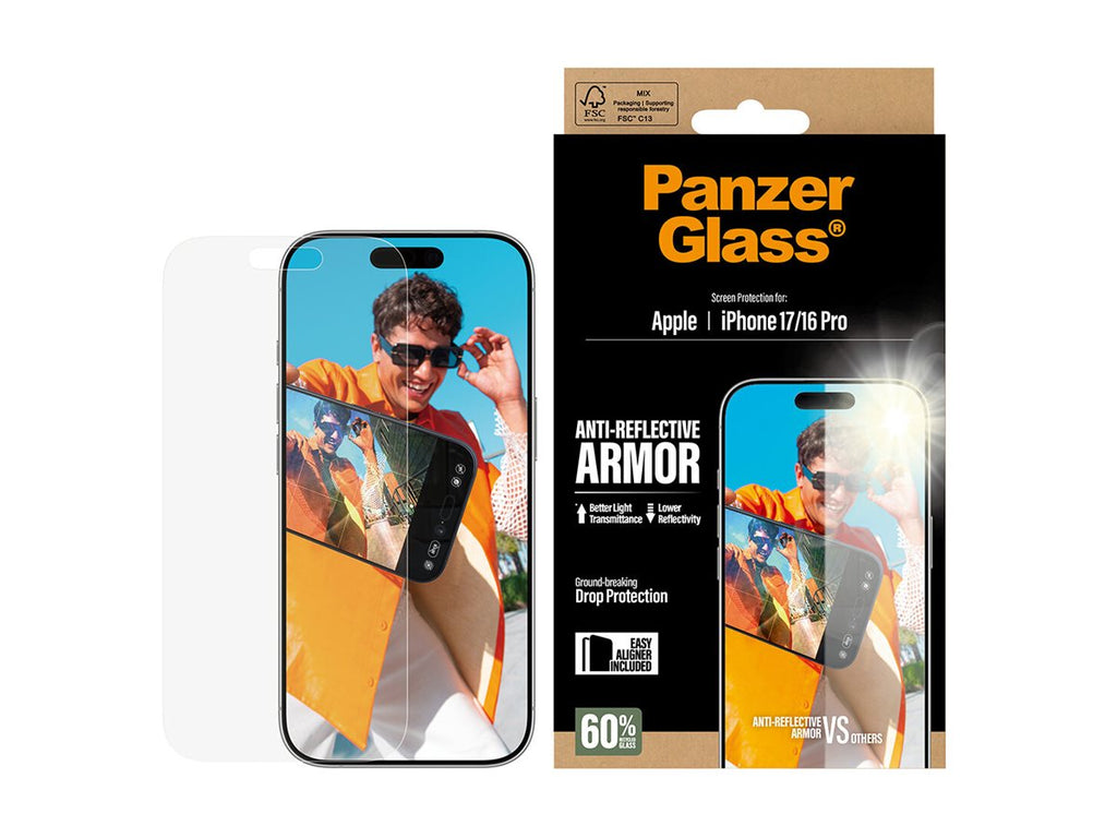 When it comes to your phone, you want protection and optimal screen readability. The Anti-Reflective Armor Screen Protector from PanzerGlass delivers both. Made with 60% recycled glass protecting your screen from everyday accidents.The new anti-reflective treatment significantly decreases reflection and increases the light transmitted. That means you can view your screen in full sunlight with barely a hint of reflection.The effect is obtained by means of a multilayer coating with different refractive indexes and a special surface structure that mimics the structure of a moth's eye. The texture provides a soft look, anti-glare properties and very low friction. With light transmission of more than 94% and reflectivity below 0.3%.Installation is a breeze, thanks to the EasyAligner included in the box. We've made it as simple as can be with step-by-step instructions and a QR code for quick access to our online how-to video. Once the protection is applied, you'll never again have to worry about your phone tumbling screen-first. This may not happen, but then again… it might!For extra protection, pair the Anti-Reflective Armor Screen Protector with PanzerGlass PicturePerfect or Hoops camera lens protectors, and a case from CARE by PanzerGlass .